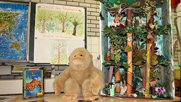 Schon zu Beginn der AG wurde schnell klar, dass die Kinder selbst aktiv werden und sich ein Stück Regenwald kaufen wollen. So wurden Spendendosen gebastelt und Geld gesammelt. Am Ende des Umweltfests waren es immerhin 215,-- Euro, die zusammen gekommen sind. Nach dem Film über Borneo und die Orangutans haben sich die Kinder dazu entschlossen, dort Regenwald zu kaufen.